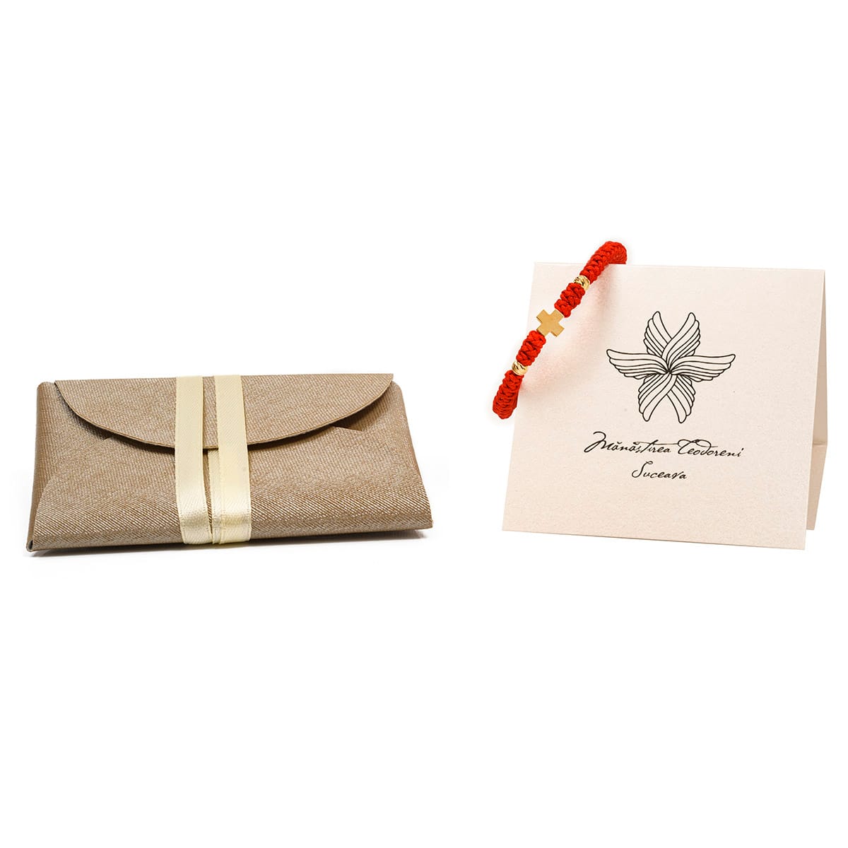 Fiecare metanie cu cruciuliță din aur ajunge la tine într-un plic de piele ecologică realizat manual la Mănăstirea Teodoreni.